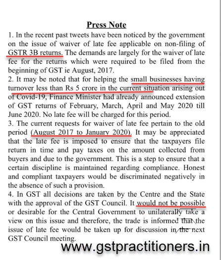 CBIC issued the press note on the issue of GST Late fee for the past periods (August 2017 to January 2020) to be discussed in the next GST Council meeting.