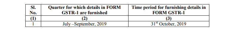 The Commissioner hereby extends the time limit for furnishing the return by a registered person required to deduct tax at source under the provisions of section 51 of the said Act in FORM GSTR-7 of the Central Goods and Services Tax Rules, 2017 under sub-section (3) of section 39 of the said Act read with rule 66 of the Central Goods and Services Tax Rules, 2017 for the months of October, 2018 to July, 2019 till the 31st day of August, 2019.